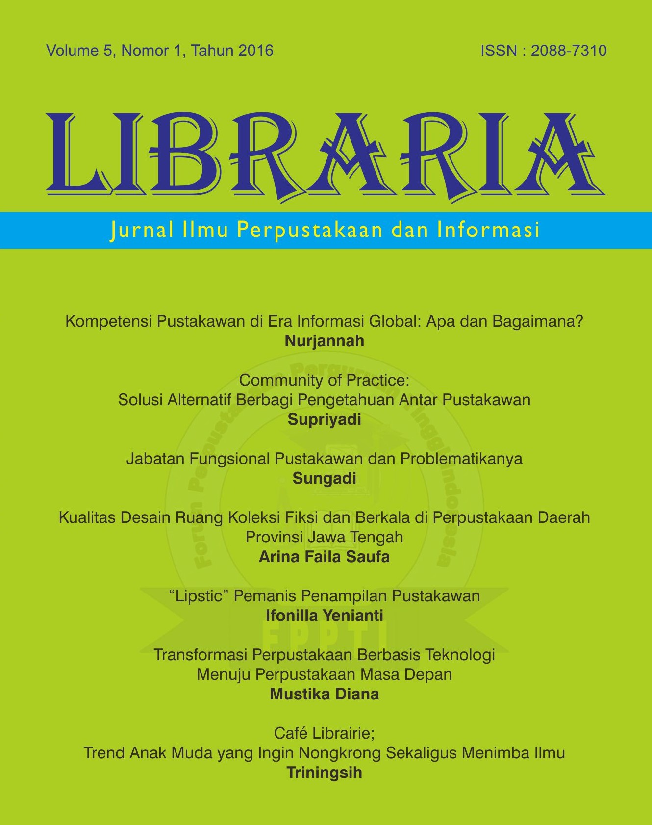Libraria: Jurnal Ilmu Perpustakaan dan Informasi is a journal for library and information science initiated by FPPTI (Indonesian Higher Education Library Forum ) Central Java, published twice annually in June and December. Libraria: Jurnal Ilmu Perpustakaan dan Informasi welcomes the submission of research, theory, and practice papers relevant to library and information science.  The article will be reviewed by the editors and reviewers who are competent in the related field. The review uses double-blind peer review before the journal is published. The journal will publish a selected paper under a Creative Commons Attribution ShareAlike 4.0 International LicenseThis journal has printed and electronic versions with registered number P-ISSN 2088-7310  (printed), e-ISSN 2614-3534 (on line).